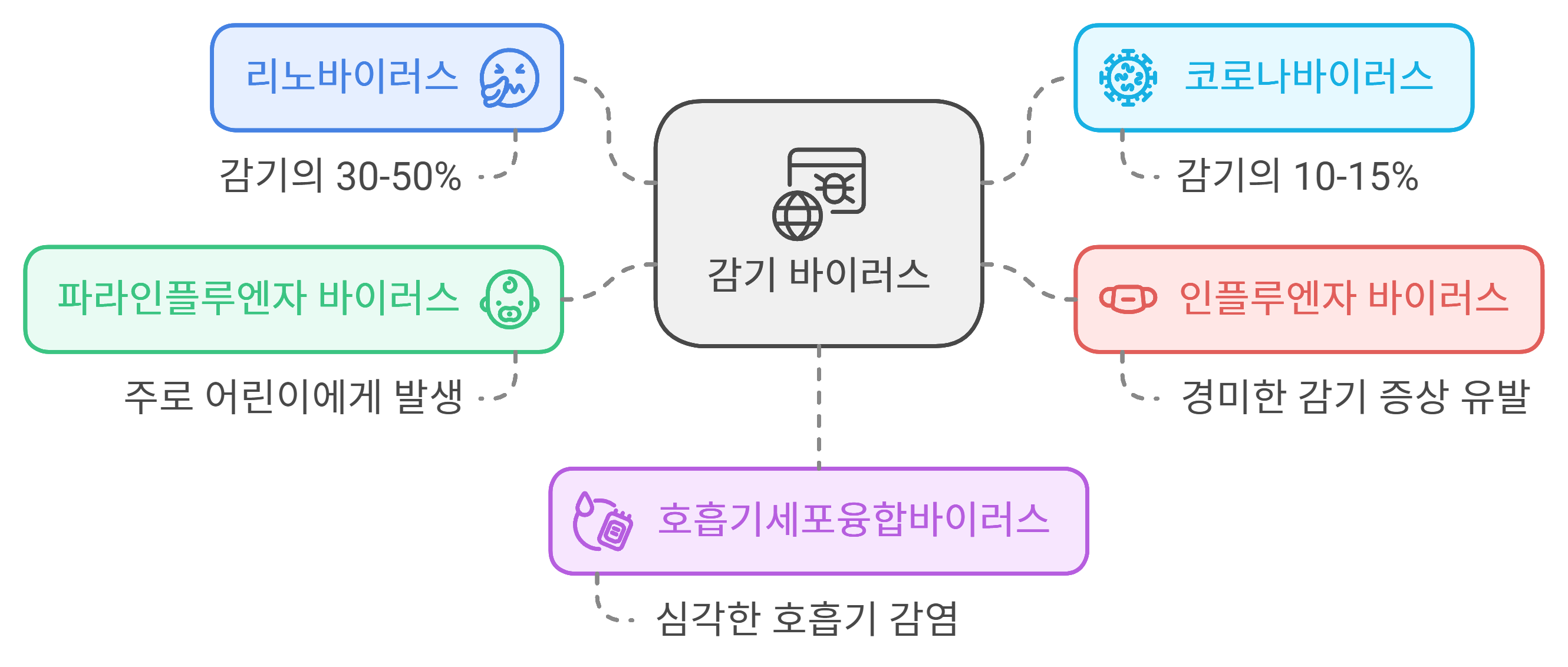 감기는 200여 종 이상의 다양한 바이러스에 의해 발생할 수 있습니다. 그 중에서도 가장 흔한 원인 바이러스는 다음과 같습니다: