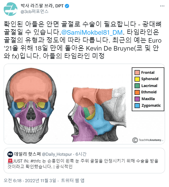 손흥민 선수의 안면골절(안와골절) 예상 분석한 물리치료사, 스포츠 과학자의 트윗이 있어서 가져왔습니다.