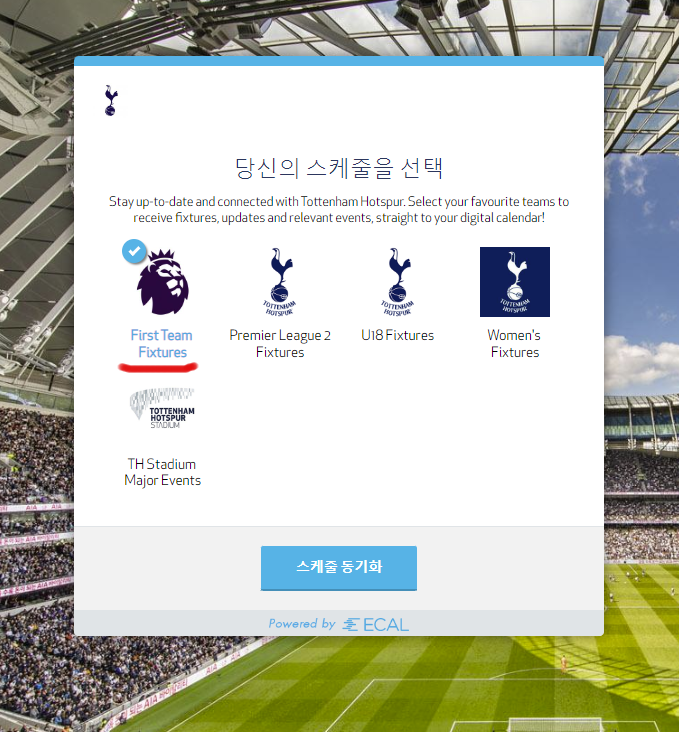 구글 캘린더에 동기화할 일정을 선택 (1군, 21세 이하, 18세 이하, 우먼스, 스타디움 이벤트)