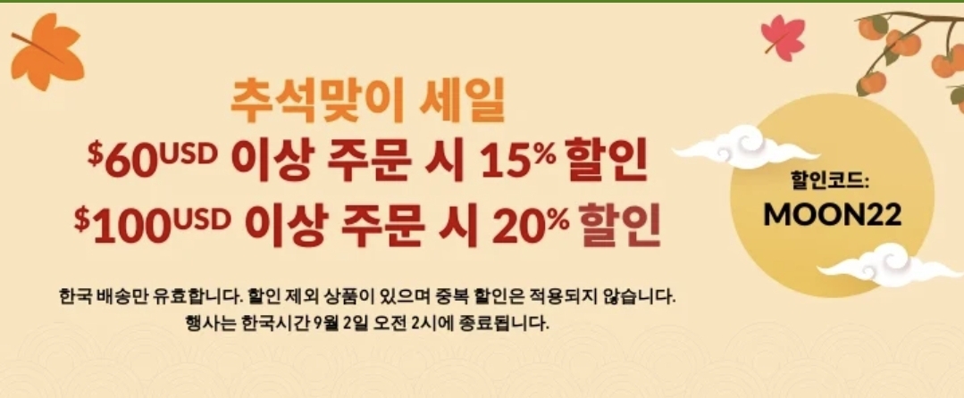 한국 배송에만 적용되고 할인 제품 코드 중복 적용 안됩니다.